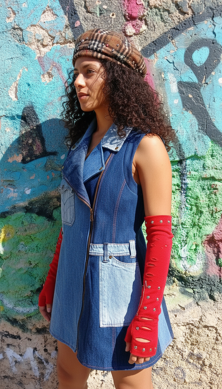 - Design Unico: Realizzato in denim rigenerato, con un taglio smanicato e un look moderno.