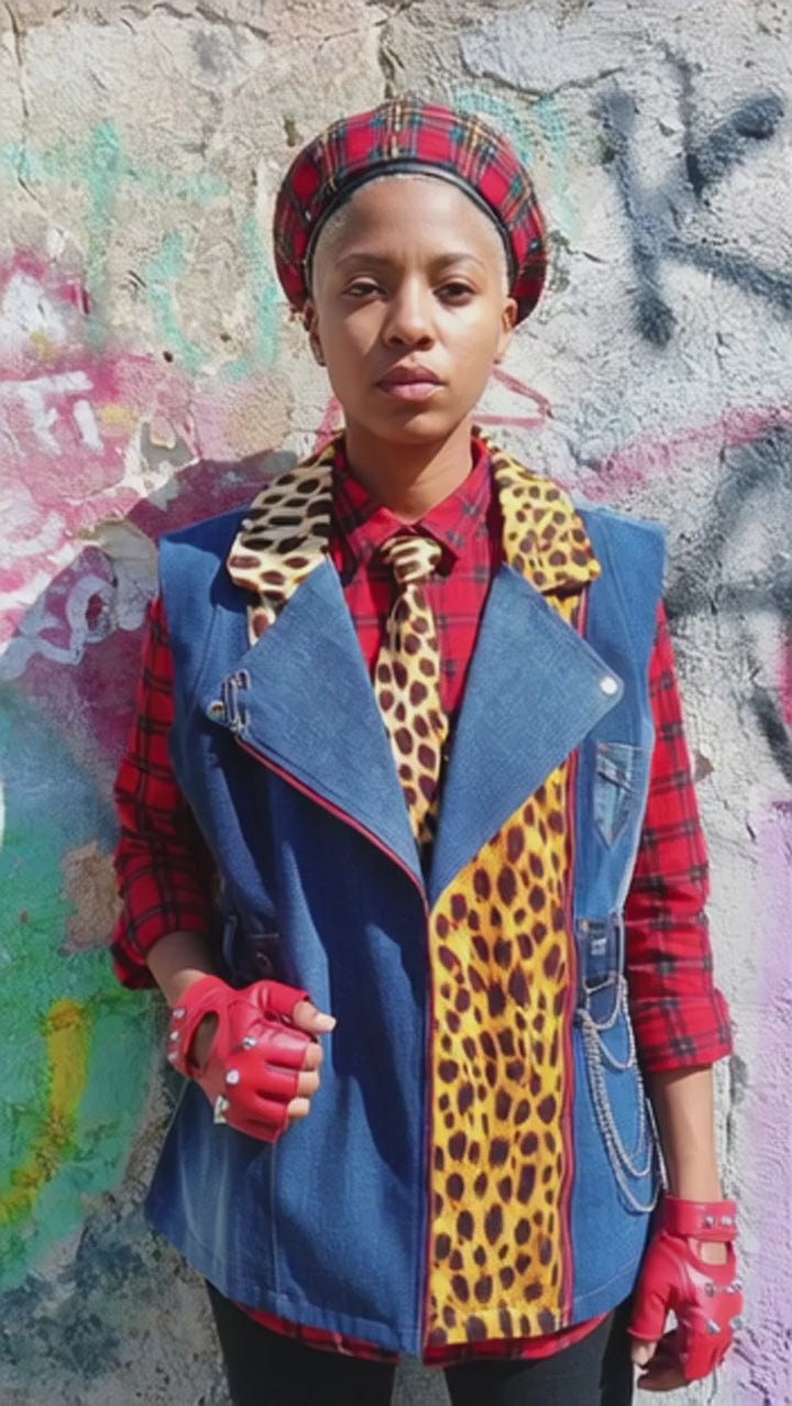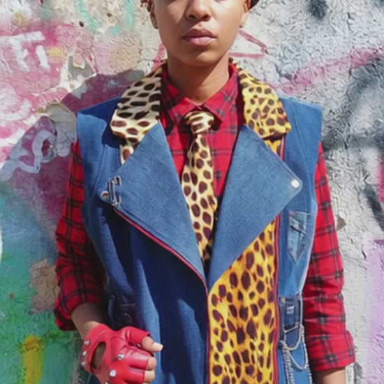 Aggiungi un tocco audace al tuo guardaroba con il nostro biker smanicato in denim rigenerato. Questo pezzo unico combina il classico denim con eleganti inserti in tessuto leopardato, creando un contrasto che cattura l'attenzione.
