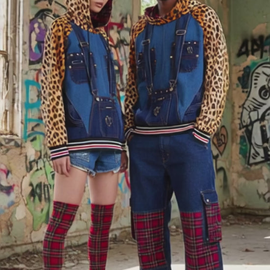 Le maniche e il cappuccio in tessuto maculato leopardato aggiungono un tocco selvaggio e glamour, mentre le tasche a marsupio donano praticità e un’essenza urban chic. I polsini e la fodera interna in tartan di viscosa completano il design, offrendo comfort e dettagli ricercati.