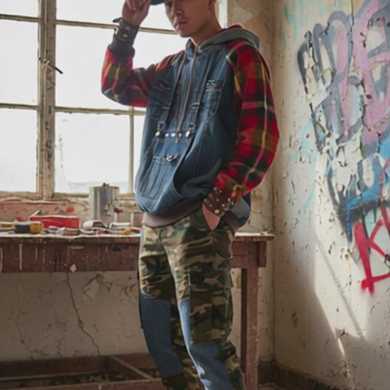Questa felpa unisex nasce dal recupero creativo di un paio di jeans a salopette, trasformati artigianalmente in un capo unico e sostenibile. Il corpo in denim riciclato è arricchito da tasche a marsupio pratiche e funzionali, mentre il cappuccio e le maniche coordinate sono foderati in tartan misto cotone, lana e viscosa, per un tocco di colore e comfort.