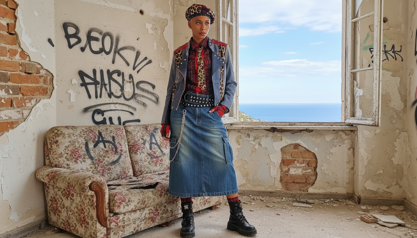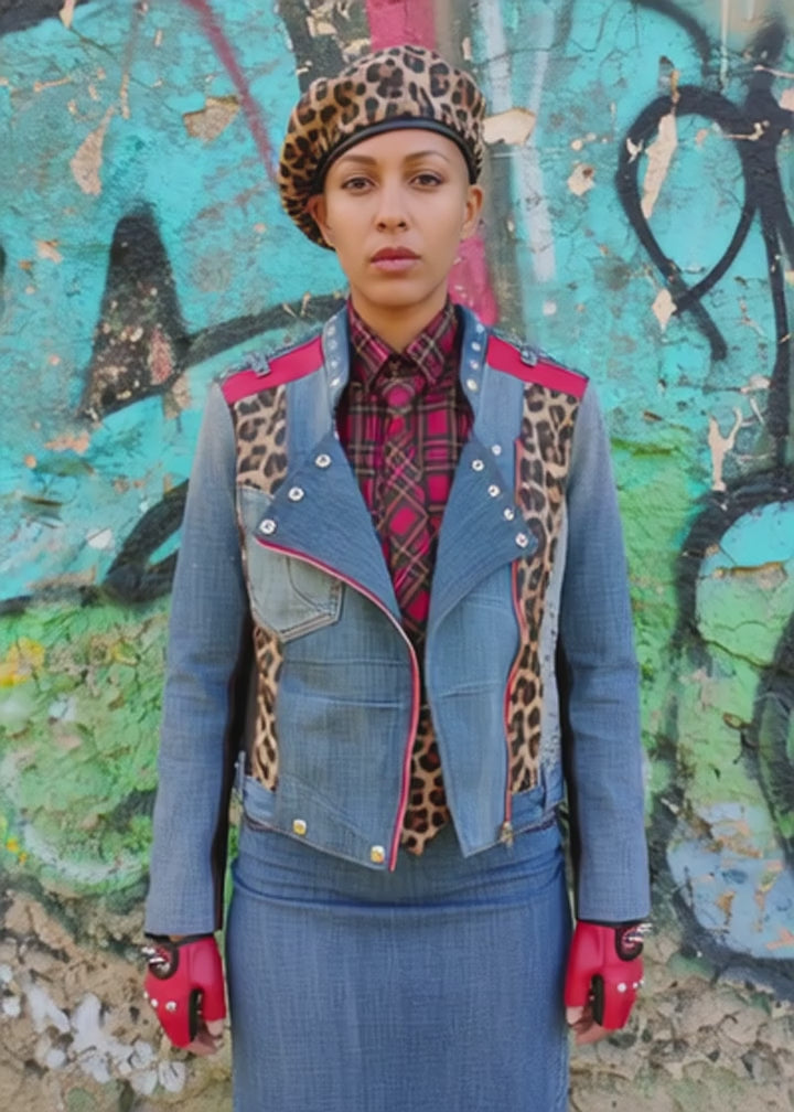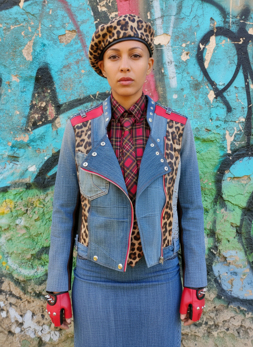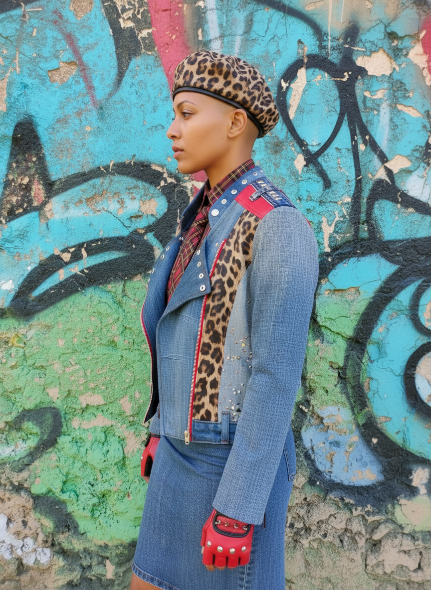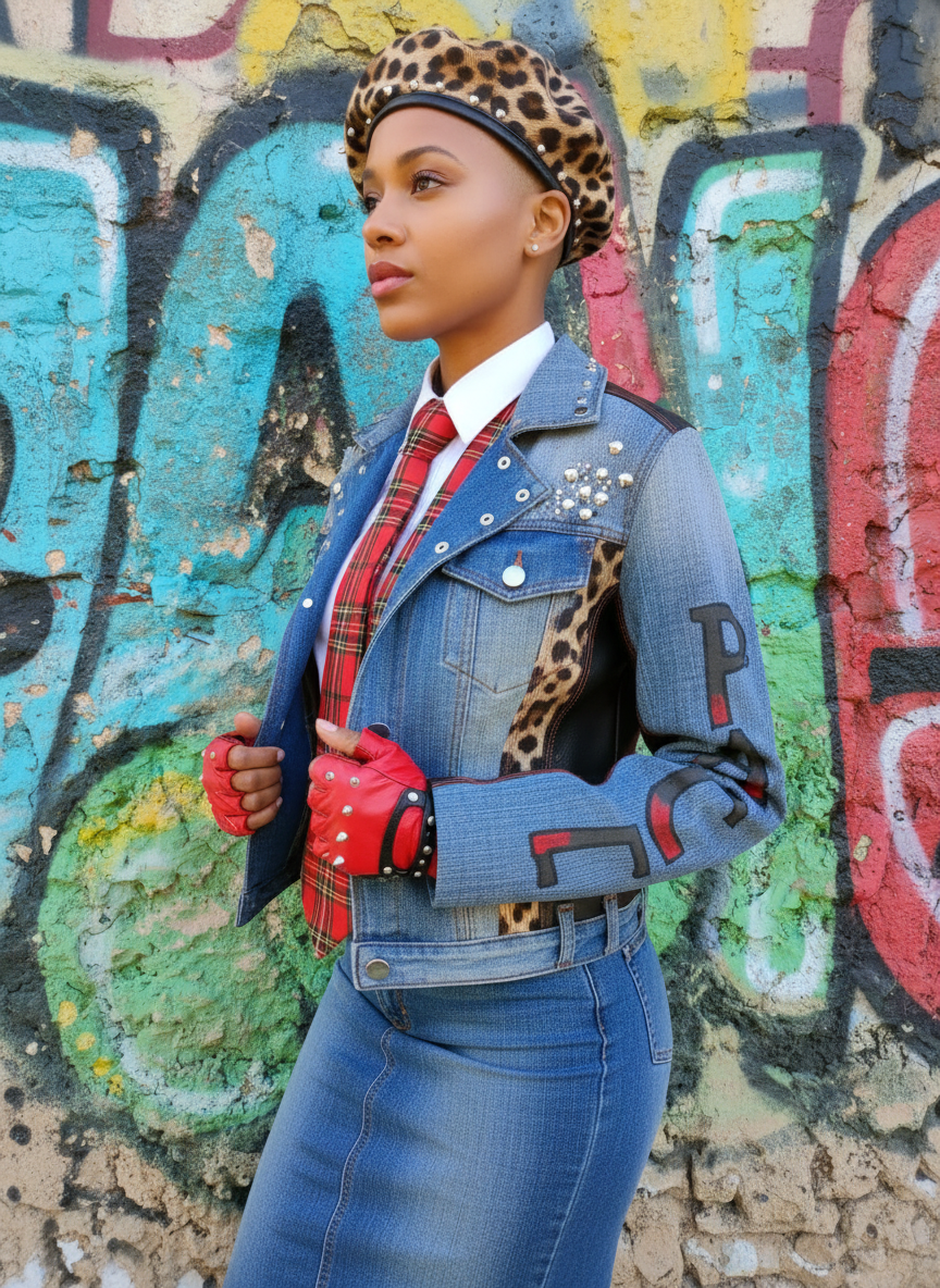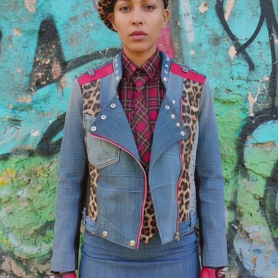 Giacca biker corta in patchwork, realizzata in denim riciclato e ecopelle maculato rosso e nero. Caratterizzata da pittura a mano e dettagli audaci, questa giacca offre una fodera in tartan di viscosa per un comfort ottimale. Un pezzo unico che unisce stile e sostenibilità, perfetto per chi desidera distinguersi con un look audace e contemporaneo. Aggiungi un tocco di originalità al tuo guardaroba!