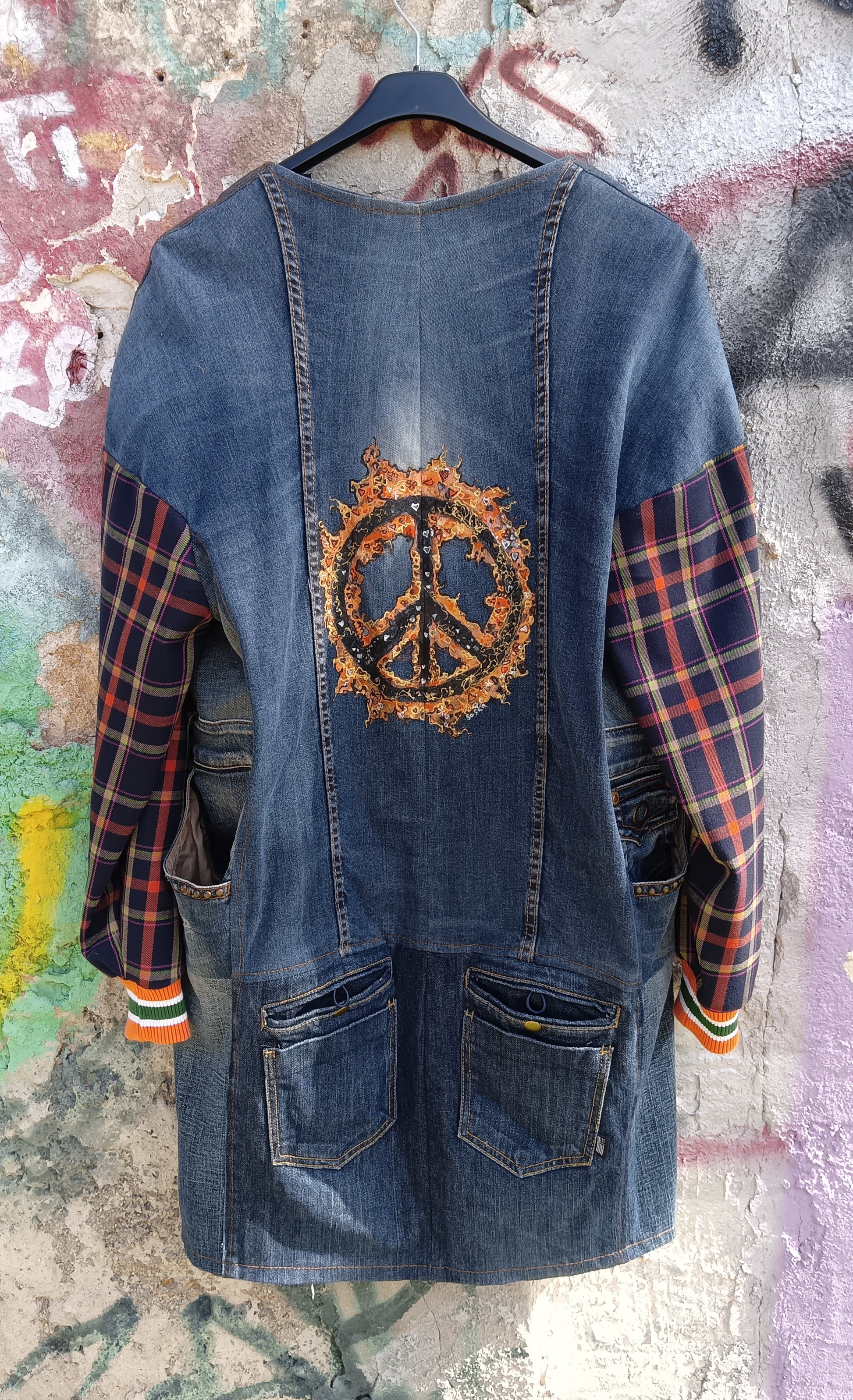 Distinguiti con questo spolverino unico, realizzato a mano in Italia utilizzando denim riciclato di alta qualità. Le maniche in tartan (misto cotone, lana e viscosa) donano un tocco punk e sofisticato, mentre la pittura a mano sul retro rende ogni capo un vero pezzo d’arte, irripetibile e originale.