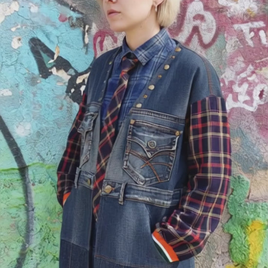 Spolverino in Denim Riciclato con Maniche in Tartan e Dettagli Artistici