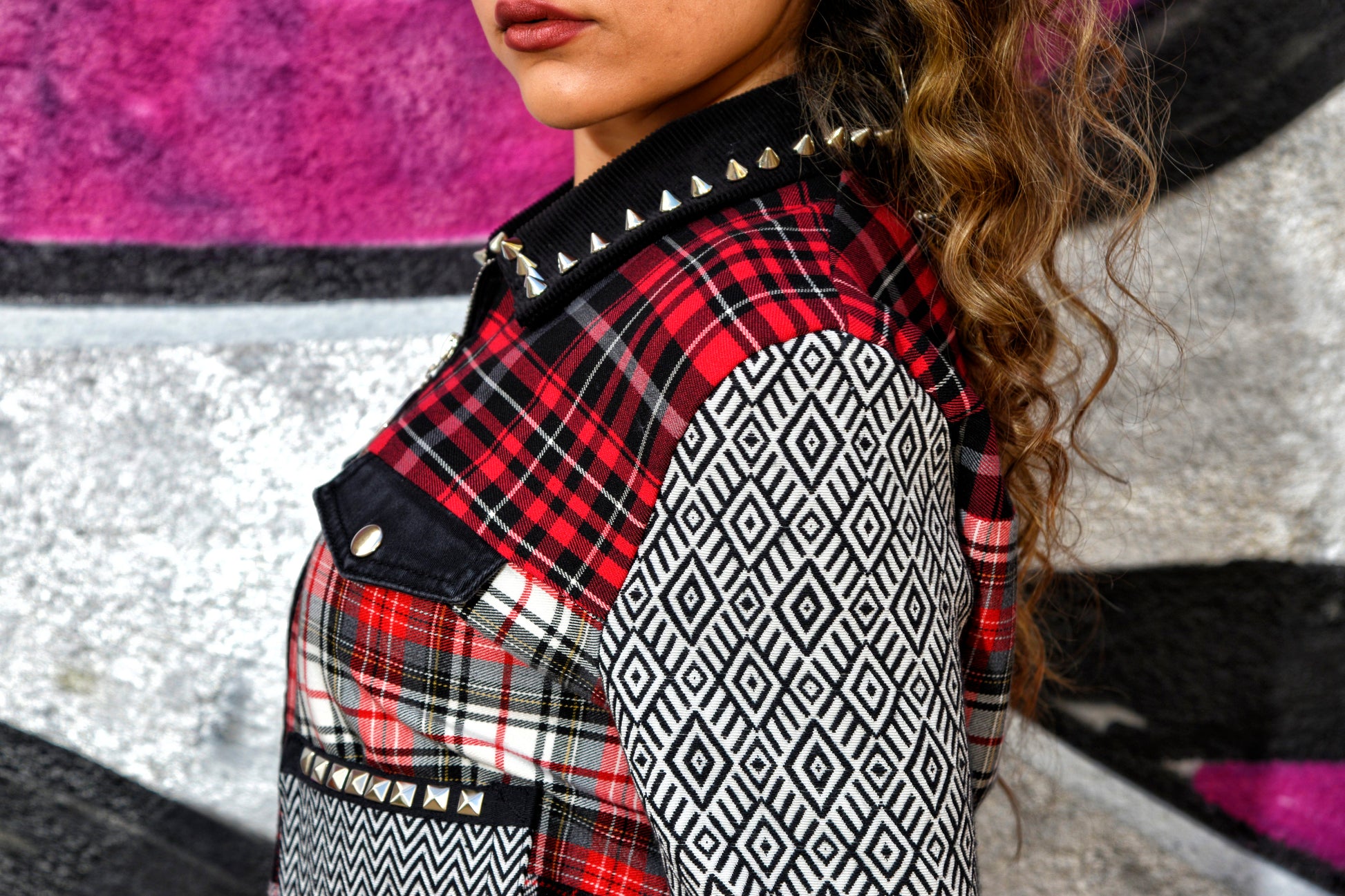 Scopri la giacca corta "Sa Bertula", un perfetto incontro tra tradizione e modernità. Realizzata in un patchwork di diversi colori in tartan e tessuti sardi, questa giacca dal taglio jeans si distingue per le frange create all'orlo in tessuto di panetto di lana. Il colletto in velluto rigato e le tasche applicate sul davanti, decorate con borchie, aggiungono un tocco punk al design. L'apertura con zip argentato in vista completa il look, rendendo questa giacca un capo audace e trendy per chi cerca uno stile unico e contemporaneo.