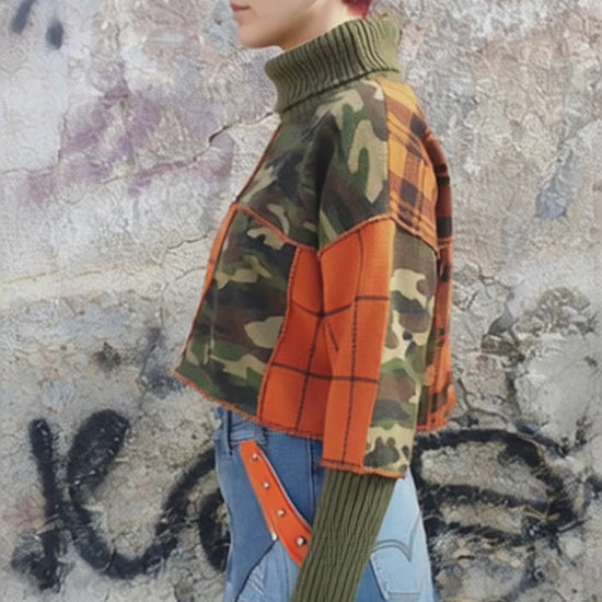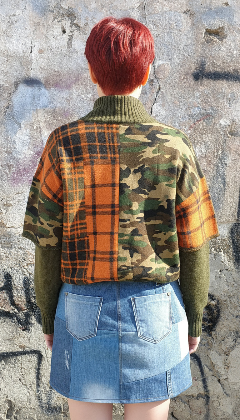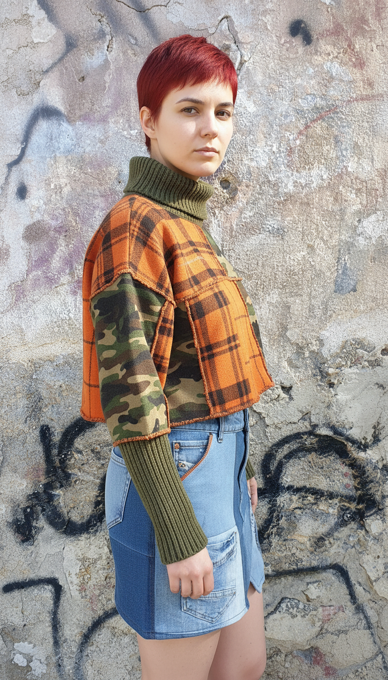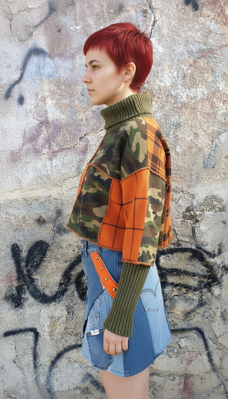 Minigonna a portafoglio, realizzata interamente in denim riciclato con inserti in ecopelle arancio. Questo pezzo unico presenta borchie decorative, un'apertura con zip metallica e bottoni per jeans, unendo audacia e stile. Ideale per chi cerca un look originale e sostenibile, questa minigonna è perfetta per aggiungere un tocco di creatività al tuo guardaroba!
