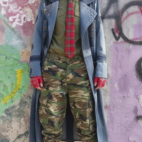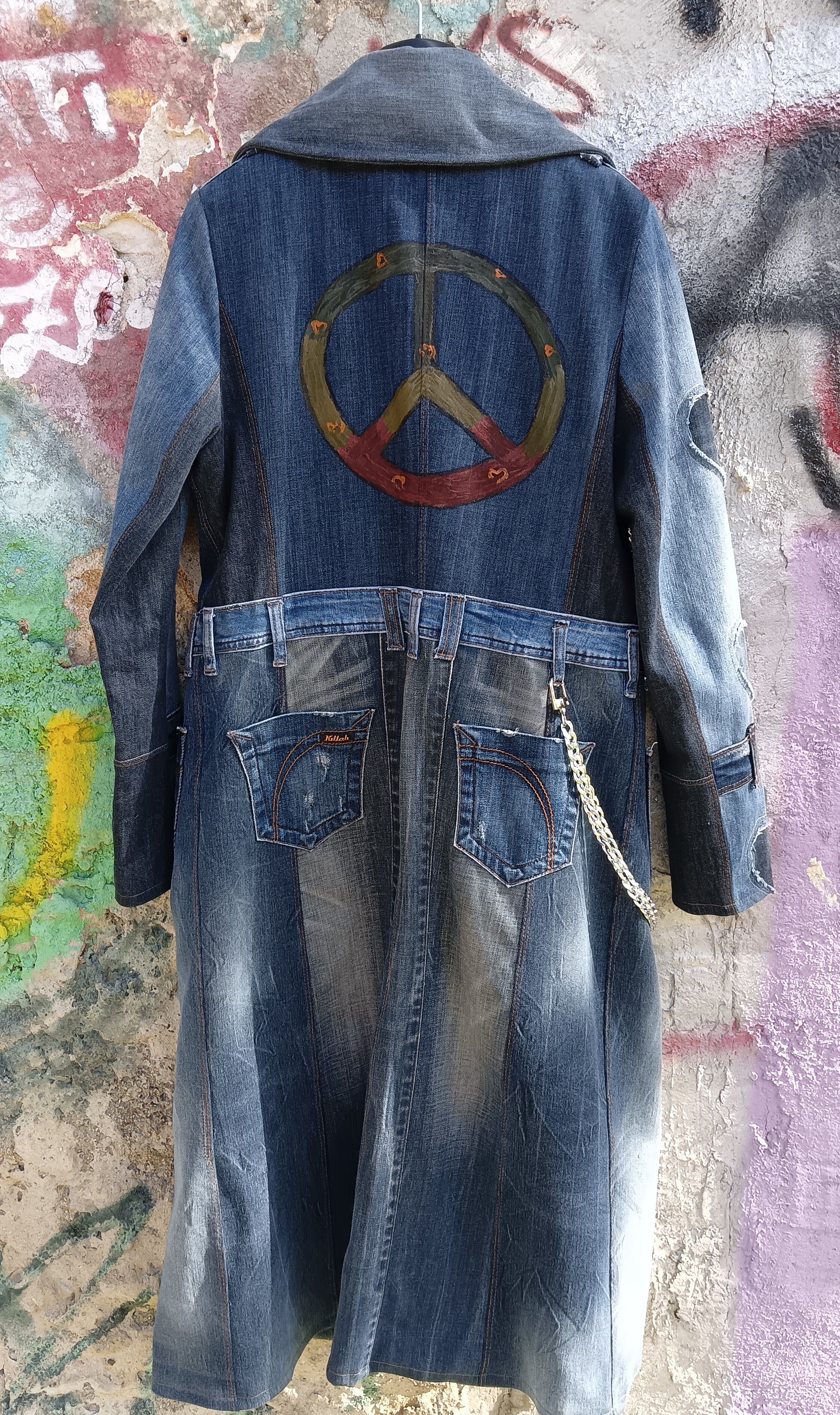 Scopri il nostro caban in denim riciclato, arricchito da una pittura a mano con il simbolo della pace. Questo capo presenta un'abbottonatura in vita con bottoni in metallo e un maxi revers decorato con borchie, per un look audace e moderno. La linea sciancrata e smilza offre una vestibilità elegante, mentre la lunghezza che sfiora quasi le caviglie aggiunge un tocco di sofisticatezza. Completamente foderato con un tessuto in stampa mimetica, è ideale per chi cerca uno stile originale e sostenibile.