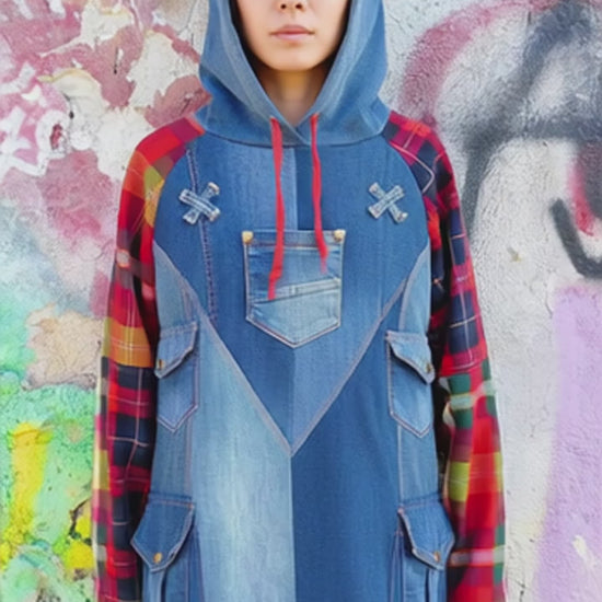 Felpa Lunga Unisex in Denim Riciclato con Maniche in Tartan e Dettagli Artistici